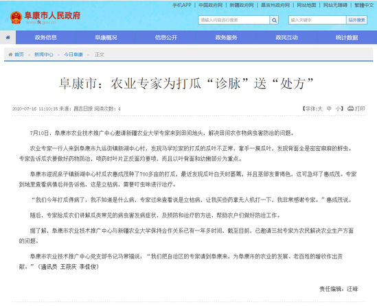 阜康市农业技术推广中心党支部书记马常福说:“我们把自治区的专家请到阜康来,为阜康市的农业的发展、老百姓的增收作出贡献。”