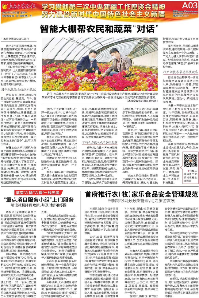 “是设施农业物联网一体化控制技术,让大棚里的植物和我们对话了。”10月28日,在乌鲁木齐市高新区(新市区)六十户乡三宫梁村设施农业生产基地,村民于天财这样说道。