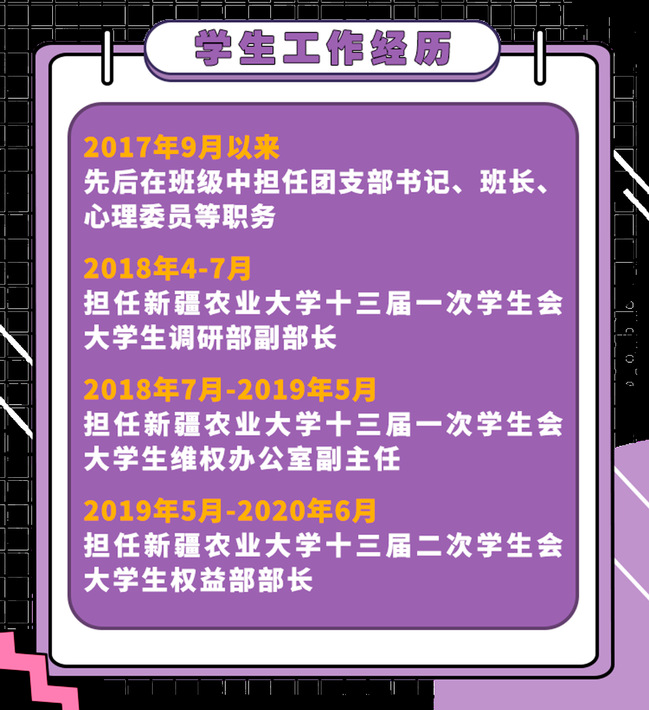 祖丽皮耶在班级担任过团支部书记、班长和心理委员等职务,同时又是校、院学生会干部的她,学生工作繁忙,但梳理的井井有条,为班级和学院赢得了很多荣誉。作为新时代青年,她认为学习是学生的本职工作,但是也要德智体美劳全面发展。“我不想让我的青春都在遗憾中度过,我要行走在青春的路上!”祖丽皮耶说。