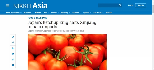 中国青年报记者注意到,外媒《日经亚洲(Nikkei Asia)》14日报道称,日本主要番茄酱生产商Kagome(可果美)已停止从中国新疆进口番茄。