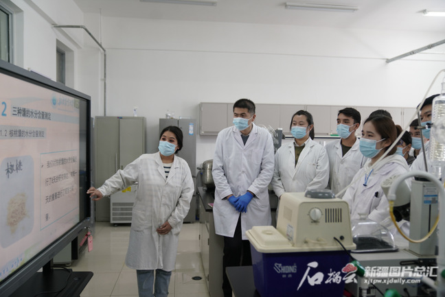 帕尔哈提·柔孜带着学生在实验室里做食品方面的科学研究。石榴云/新疆日报记者 豆兴军摄