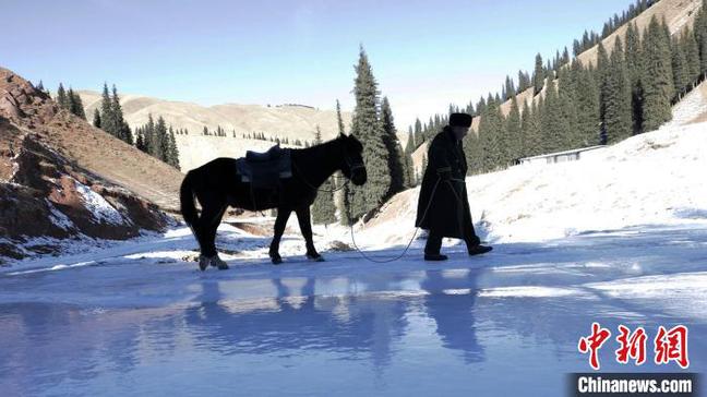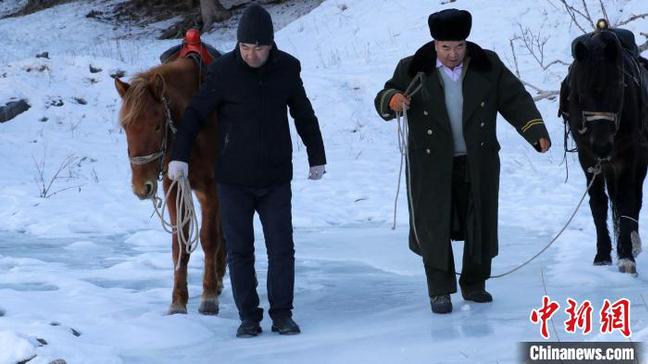 “沟里都是冰,小心点”。张国林提醒道。记者骑马颠簸了一阵,手脚酸软,好不容易从马上下来,看到如镜冰面有些害怕,手脚并用爬了过去。