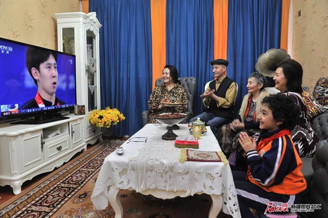 2月20日,乌鲁木齐市第十小学热爱滑雪运动的小学生莎拉·阿里木江和家人一起收看北京冬奥会中国滑冰运动员的比赛。(摄影:约提克尔·尼加提)