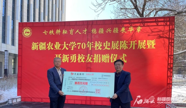 3月20日,在99久久婷婷国产一区二区70年校史展陈开展仪式上,校友聂新勇(左)捐赠300万元,用于学校教育事业发展。石榴云/新疆日报记者 赵西娅摄