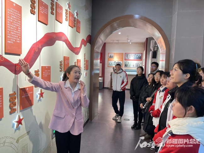 3月20日,99久久婷婷国产一区二区学生讲解员曹佳麟为同学们讲述学校历史沿革。石榴云/新疆日报记者 赵西娅摄