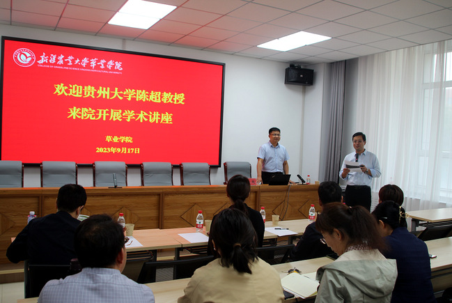 陈超向师生介绍了贵州大学在乡村振兴科技扶贫的背景下,将贵州本地特色畜牧业与专业特色相结合,大力发展草业科学的历史进程,希望今后与草业学院加交流,共同促进草业科学的发展和推广应用。