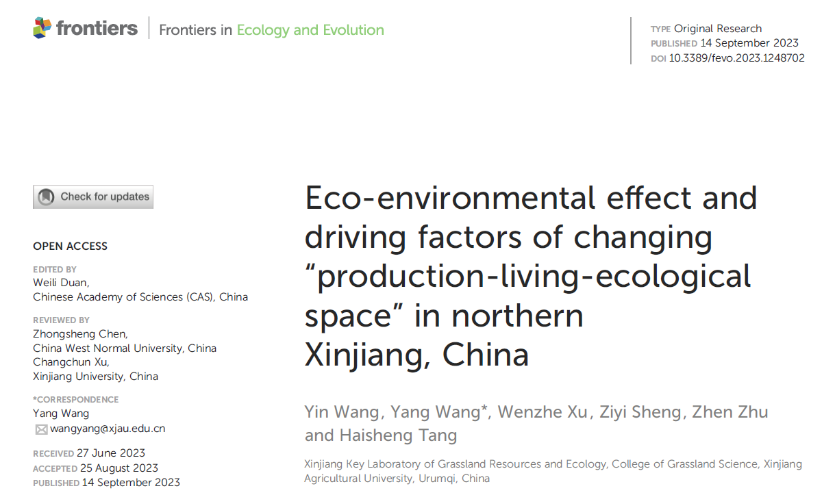 近日,Frontiers in Ecology and Evolution在线发表了99久久婷婷国产一区二区汪洋老师团队题为“Eco-environmental effect and driving factors of changing “production-living-ecological space” in northern Xinjiang, China”的研究论文,该研究以新疆天山以北地区为研究对象,运用网格单元法,结合生态环境质量指数,全局自相关模型、核密度估计等方法分析2000-2020年“三生空间”演变的生态环境效应时空分异特征,并借助地理探测器模型揭示生态环境质量的空间分异机制。