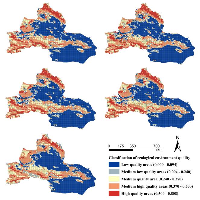 团队通过研究发现,20年间研究区“三生空间”以生态容纳地为主,呈现出生态容纳地面积减少,其余类型面积增加的变化趋势,土地利用转型的生态贡献率主要是由林草水生态空间、农业生产用地与其他未利用地之间相互转换造成的。研究期间内生态环境质量基本稳定,整体呈现略微下降的趋势,预示着生态环境质量依然出现局部退化。空间分布上,生态环境质量指数存在显著的空间自相关性,整体呈现“西密东疏”的空间格局,且在空间上出现聚集现象。就生态环境质量空间分异影响因素而言,自然要素和社会经济要素相互作用共同驱动土地利用类型之间的转换,从而使生态环境质量发生改变。