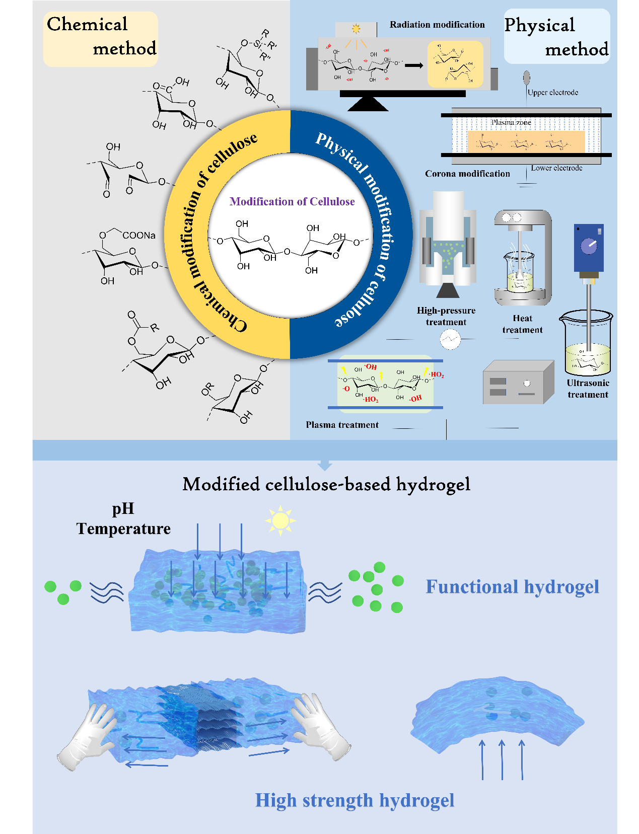 对纤维素进行改性是扩大其应用范围的一种选择,也是对溶解的一种补充。根据是否加入化学试剂,纤维素的改性可分为物理改性和化学改性。物理改性主要有:热处理、高压处理、超声处理、等离子体处理、电晕技术、辐射改性。主要是通过外部能量(如高压、高温、超声波处理)改变纤维素的结构和表面性能,极大地改变了纤维素的表面性能,赋予纤维素新的性能和功能(如图3所示)。化学改性包括氧化、酯化、醚化、硅烷偶联。化学改性对纤维素理化性质的影响取决于溶剂是否温和。在浓酸性和浓碱性介质中,纤维素的表面官能团发生变化,同时纤维素分子量降低,这对改善纤维素基水凝胶的力学性能产生不利影响。在温和的试剂中进行改性,既能在纤维素表面引入理想的官能团,又能最大程度地保持原有的聚合度,有利于获得具有优异力学性能的纤维素基水凝胶(图3)。