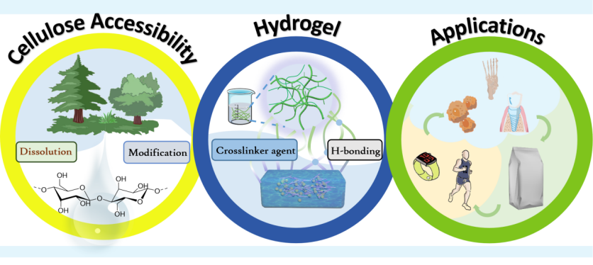 天然大分子基水凝胶在生物相容性、可持续性和可降解性等方面存在优势,已被广泛应用于生物医学工程、食品包装、表面涂层、药物输送和传感器等领域(如图1所示)。纤维素是自然界中分布最广泛的可再生资源之一,因此被广泛用作水凝胶制备的原料。受分子内和分子间非共价作用力的影响,纤维素纤维可分为结晶区和非结晶区,不利于纤维素于常规溶剂中溶解,从而影响纤维素衍生物以及纤维素基水凝胶的制备及应用(图1)。