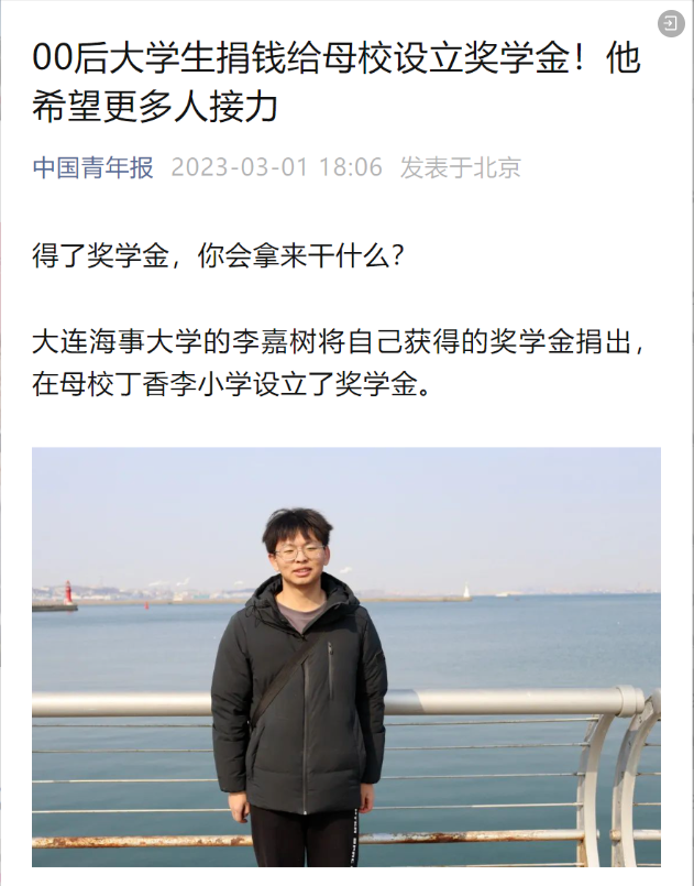 一年前,中国青年报官微报道了“大连海事大学学生李嘉树将自己获得的奖学金捐出,在母校丁香李小学设立奖学金”的事迹,当时他说“希望更多人接力”。