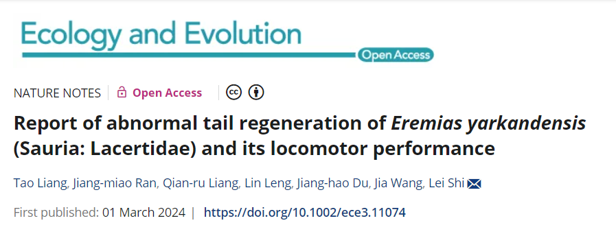 近日,新疆农业大学生命科学学院时磊教授团队在国际著名生态学期刊Ecology and Evolution发表题为"Report of abnormal tail regeneration of Eremias yarkandensis (Sauria: Lacertidae) and its locomotor performance"的研究成果。