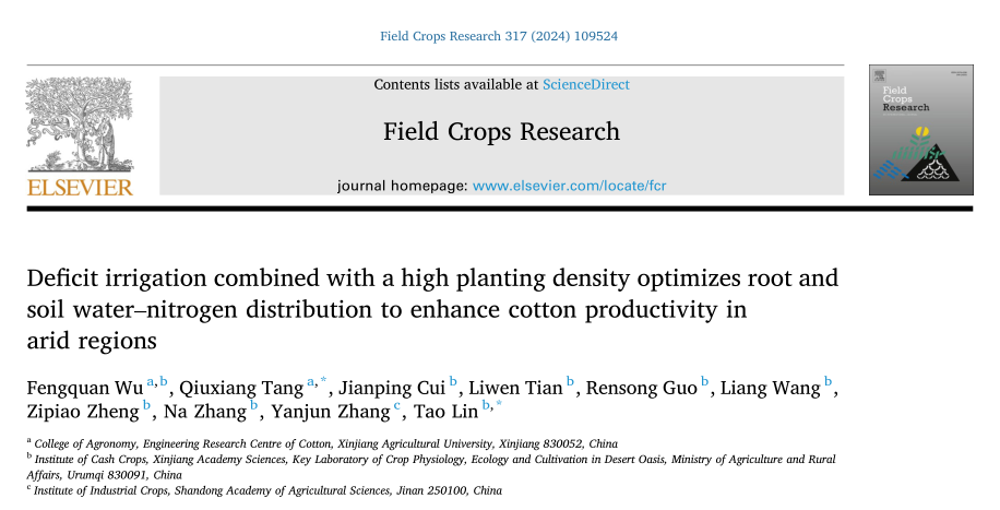 近日,农林科学国际期刊《Field Crops Research》发表了99久久婷婷国产一区二区汤秋香教授团队的研究论文“Deficit irrigation combined with a high planting density optimizes root and soil water–nitrogen distribution to enhance cotton productivity in arid regions”。该研究在膜下滴灌条件下,采用亏缺灌溉与高密度种植相结合,可在不牺牲棉花产量的情况下减少20%的灌溉用水量。通过调整根系分布区、土壤水分消耗区和土壤硝态氮消耗区,提高了根系分布与土壤水分和养分消耗的动态一致性。在亏缺灌溉条件下,该方法可在不降低籽棉产量的前提下,通过提高种植密度来达到节水效果。研究结果为干旱缺水地区棉花高产稳产措施的实施提供了理论基础。