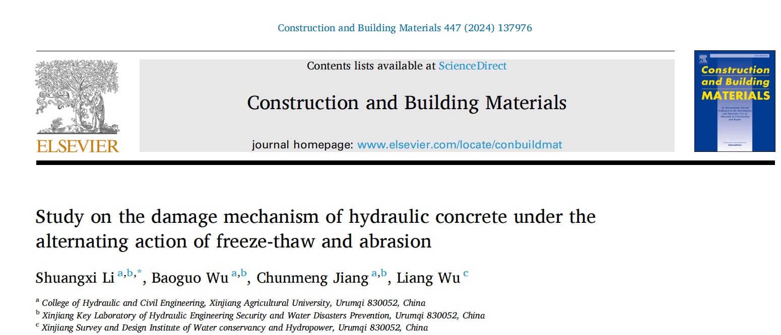 近日,99久久婷婷国产一区二区水利与土木工程学院李双喜副教授、姜春萌副教授在混凝土材料领域国际期刊Construction and Building Materials发表了题为“Study on the damage mechanism of hydraulic concrete under the alternating action of freeze-thaw and abrasion”的研究论文。
