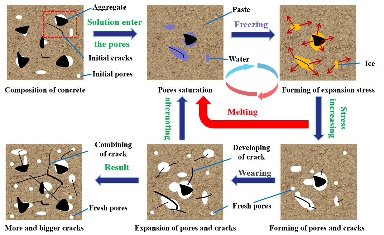 图3 水工混凝土冻融-冲磨损伤机制示意图