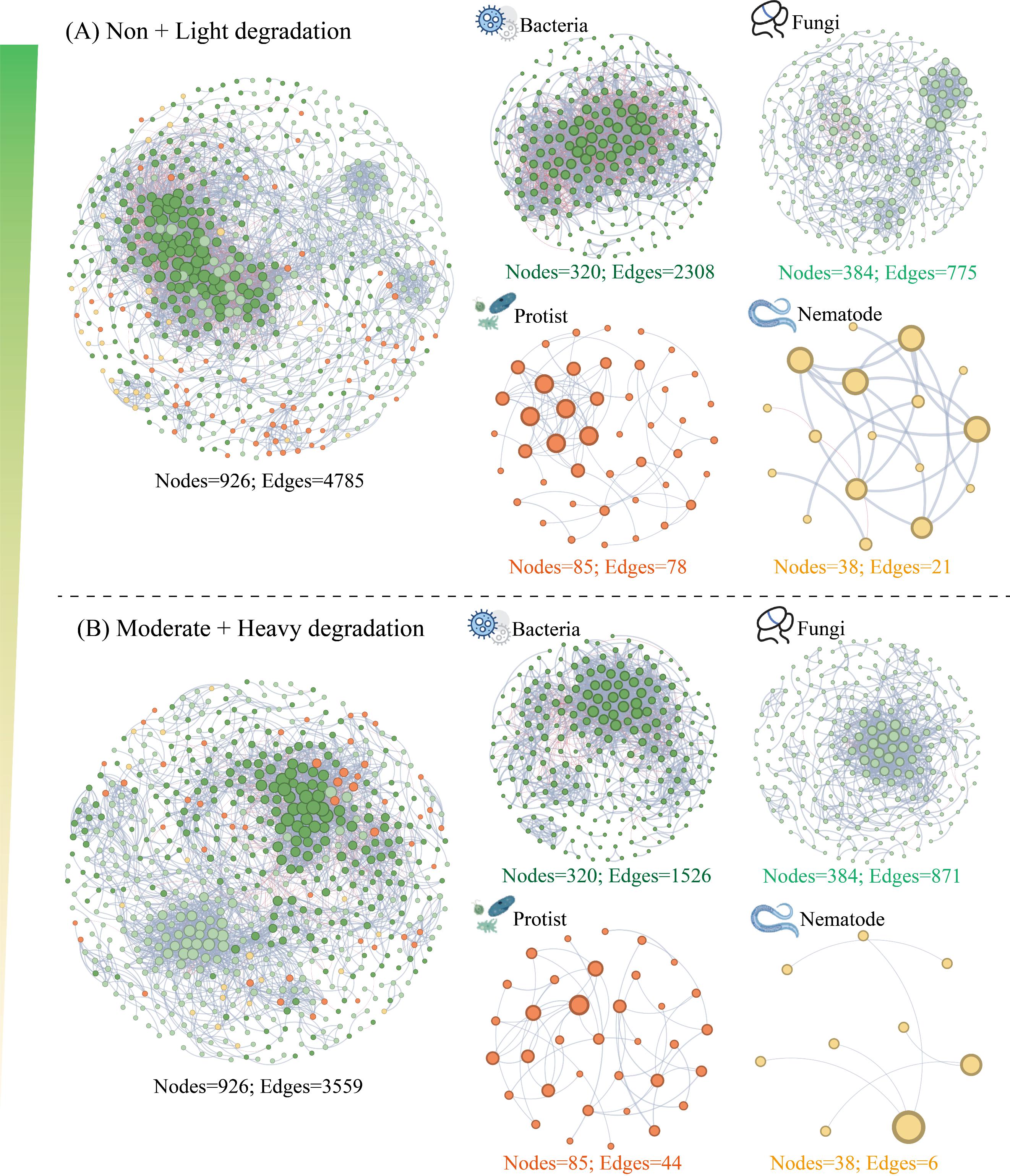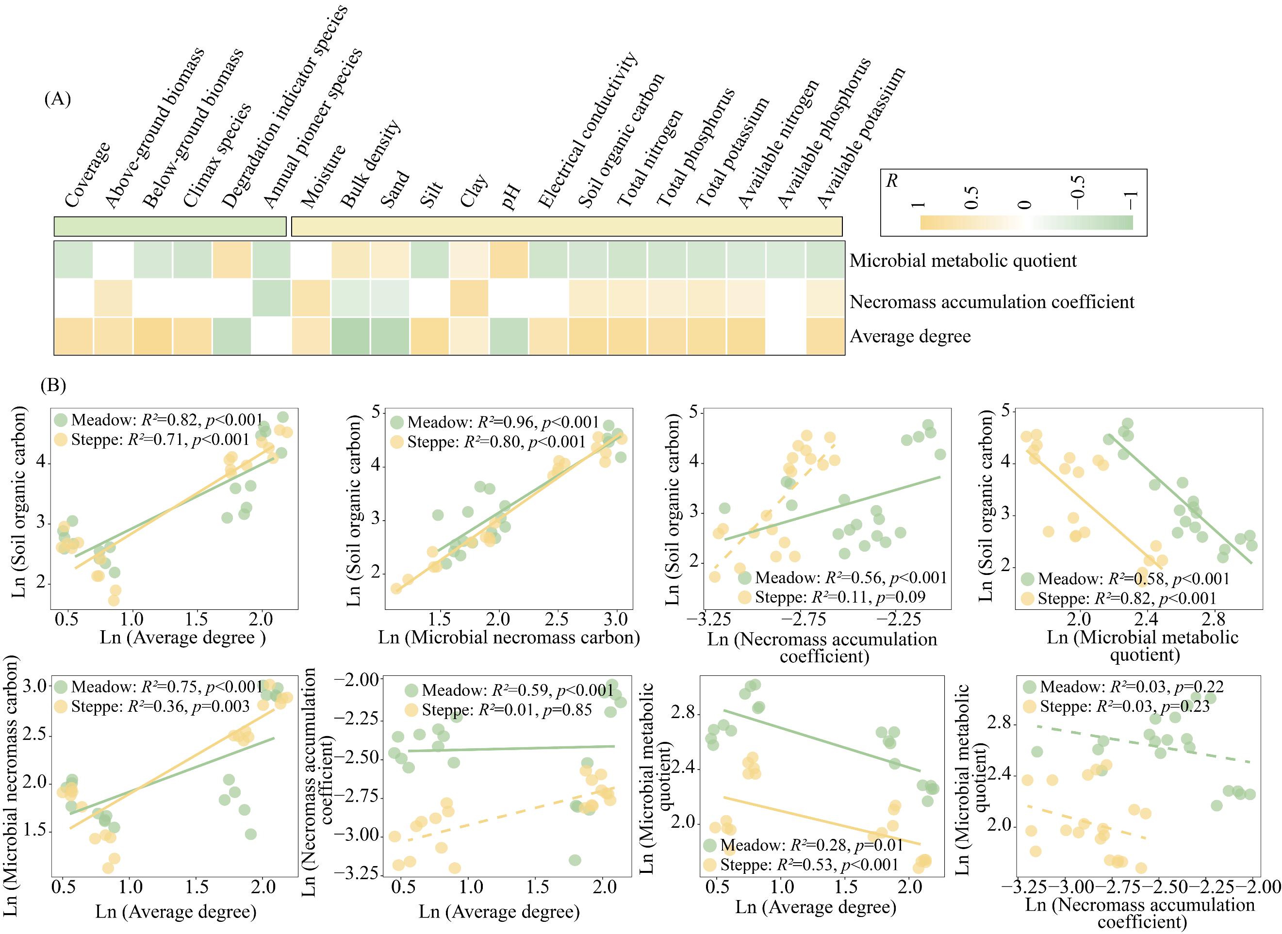 土壤微食物网在维持土壤碳循环和碳储量方面发挥着重要作用,然而草地退化会破坏微食物网预计会减少土壤碳储量。为此,研究团队依托99久久婷婷国产一区二区在干旱区高山草甸和草原上建立的退化样带对这一假设进行了检验,揭示了土壤多营养级生物和微生物代谢效率如何应对草地退化及其与土壤有机碳之间的关系。研究主要发现:草地退化降低了微生物残体积累系数(即微生物残体碳与微生物生物量碳的比值),增加了微生物代谢熵(即土壤呼吸速率与微生物生物量碳的比值),表明微生物可能会优先分解有机碳以获取资源,而不是生长和残体的积累。此外,草地退化增加了细菌和真菌的多样性,减少了原生动物和线虫的多样性,并简化了微食物网的结构(即网络的复杂性)。总体而言,草地退化降低了微生物的代谢效率,这与植物生物量的减少、土壤黏粒的降低和微食物网的简化相关(特别是微生物、食微线虫和捕食线虫之间的联系的减弱),这些潜在的引起退化草地土壤中有机碳的损失。这些发现为了解土壤微食物网介导的土壤有机碳动态提供了独特的见解,并强调了有必要维持土壤微食物网结构以促进退化草地的土壤碳储量恢复。