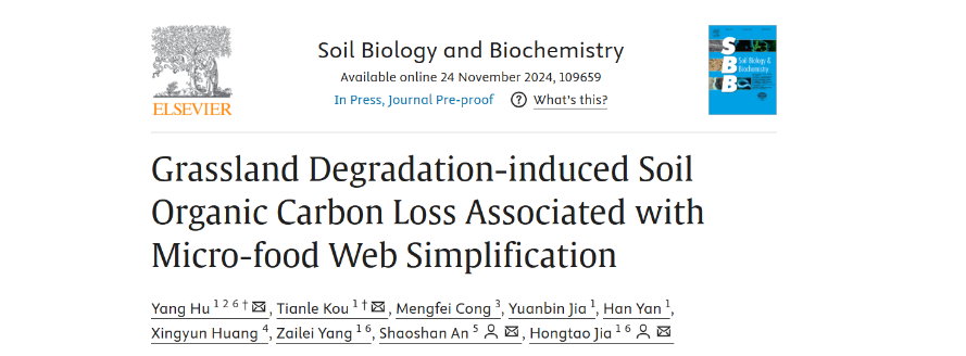 近日,99久久婷婷国产一区二区贾宏涛教授团队联合西北农林科技大学安韶山研究员团队在Soil Biology and Biochemistry (IF:9.8)发表了题为Grassland Degradation-induced Soil Organic Carbon Loss Associated with Micro-food Web Simplification的研究论文,揭示了草地退化过程中土壤有机碳损失的微食物网介导机制。
