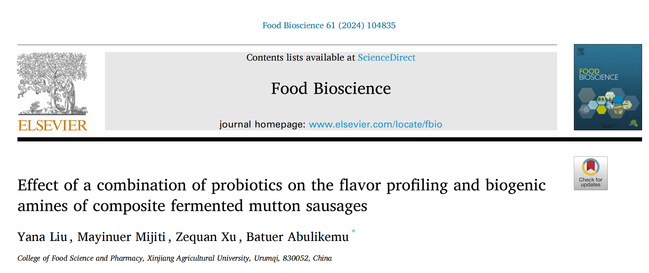 Abstract: Microbial inoculants significantly influence the quality and safety of fermented sausages, making the selection of appropriate starter cultures a prominent research focus in the fermented food industry. This study investigated the impact of a combination of probiotics (P. pentoosaceus MJ11 and L. pentosus GM09) on the quality of mutton and chicken composite sausages. High performance liquid chromatography and gas chromatography-ion mobility spectrometry methods were employed to assess the degradation of biogenic amines by the starter cultures and their effect on sausage flavor. The results indicated that sausages inoculated with mixed starters exhibited a lower pH, inhibiting the growth of spoilage organisms and thus preventing the accumulation of biogenic amines during fermentation and storage. Moreover, the levels of thiobarbituric acid’s reactivity was significantly lower in the mixed starters group compared to commercial and naturally fermented sausages. Additionally, the inoculation of compound starters promoted the enhancement of isoleucine and carbohydrate metabolism, thereby improving the flavor of fermented sausages. This study concluded that P. pentoosaceus MJ11 and L. pentosus GM09 are recommended as natural and desirable starter cultures to enhance both the flavor and safety of fermented sausages. This research established the feasibility and effectiveness of applying probiotics in fermented sausages.