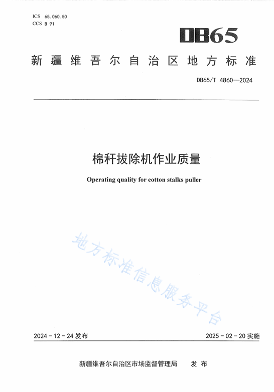 该标准规定了棉秆拔除的术语、作业质量要求、检测方法及检验规则等内容,适用于新疆地区棉秆拔除机作业质量评定。