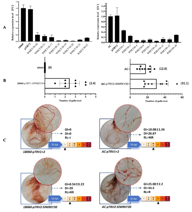 随后对‘AC’和‘18060’两番茄植株均进行SlWRKY30瞬时沉默(VIGS)验证。结果显示,‘AC’中沉默植株的根结指数(GI)为25,病情指数(DI)为44.4;而在对照植株中,GI为10.08,DI为26.67。在‘18060’沉默植株中,GI为0.54,DI为20;而在对照植株中,GI和DI均为0。