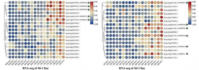 团队前期对南方根结线虫(M. incognita)具有抗性的番茄自交系‘18060’(Mi-1/Mi-1)和秘鲁番茄‘LA3858’(Mi-3/Mi-3)进行接种处理和RNA-seq分析。通过统计不同接种阶段各样本的FPKM值,分别在Mi-1和Mi-3番茄中筛选出共17个和16个差异表达的SlWRKYs基因。基于对抗病和易感组之间共表达模式分析,重点关注3 dpi和6 dpi时的基因上调趋势,发现在Mi-1和Mi-3番茄中分别有5个和6个SlWRKYs基因被显著诱导。