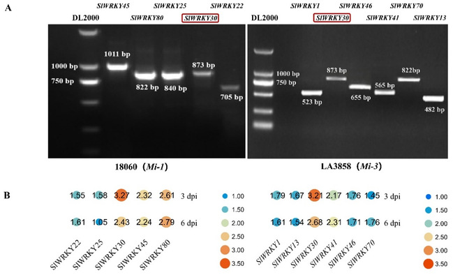通过对筛选的目标SlWRKYs基因进行根部表达模式鉴定,重点关注SlWRKY30。在Mi-1番茄的3 dpi阶段,SlWRKY30的表达显著上调,增加了11.02倍,较其它SlWRKYs呈现最大增幅。在6 dpi阶段,其表达倍数降至5.70。同样,在Mi-3番茄的3 dpi阶段,SlWRKY30差异倍数增加高达9.15倍,而在6 dpi阶段,仍表现出7.31倍的差异表达。